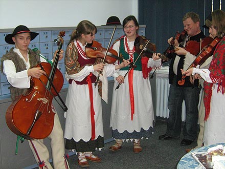 , zagraĹa i zaĹpiewaĹa Bibliotece Suskiej kapela âMaĹa Ziemia Suskaâ pod kierownictwem StanisĹawa Kubasiaka.