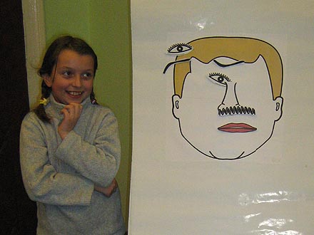 cej na przyczepianiu ust, oczu i nosa do namalowanej na planszy twarzy…oczywiĹcie z zawiÄ