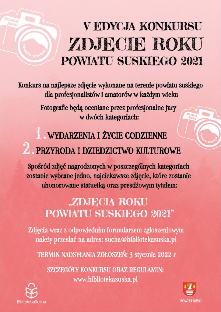 Już po raz piąty Biblioteka Suska wraz z Powiatem Suskim w Suchej Beskidzkiej zaprasza fotografików amatorów i profesjonalistów do udziału w kolejnej edycji Powiatowego Konkursu Fotograficznego - ZDJĘCIE ROKU POWIATU SUSKIEGO 2021.